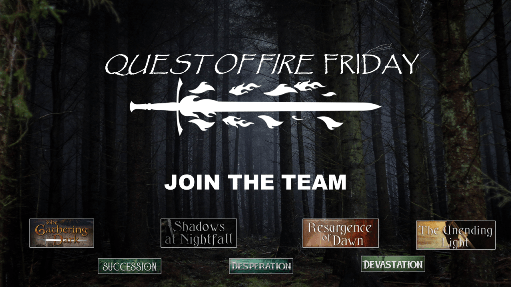 Okay, all pitch talk (and whatever that just was) finished. Seriously though it means a lot that you’ve stuck with me this long and I don’t tend to be this aggressive about trying to enlist support, but this story deserves it. It’s the culmination of twenty years of dreaming and drafting and lots of prayer. If you’re new to the series, I hope you’ll join the Quest of Fire! For those of you who have long journeyed the Lowlands with me, hang on a little longer dear friends, the King’s Day is coming and with it the unending light.
